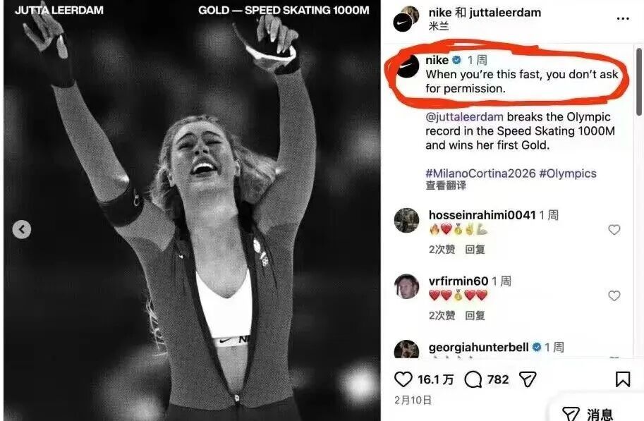 在照片刷屏后,耐克官方账号迅速跟进,发布了那张黑白庆祝图,并配文:“When you're this fast, you don't ask for permission.”(当你快到这个地步,根本无需请求许可)。