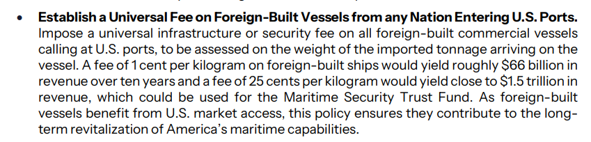 该计划第一部分包含一个建议,对停靠在美国港口的外国建造的商船,依据进口货物的重量,征收统一费用。并举了两个例子:如果按每公斤收费1美分计算,10年内将带来约660亿美元的收入;如果按每公斤25美分收费,将产生近1.5万亿美元的收入。