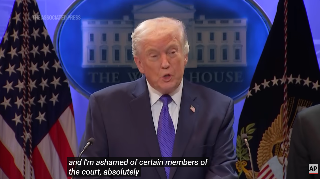 在自己的大规模关税政策被美国最高法院裁定违宪后,特朗普在记者会上公开称判决“可耻” AP视频截图